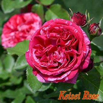 赤地に白色の美しい絞りが入る花弁は、幾重にも重なりふんわりと豊かなボリュームがありながら、花もちにも優れています。樹形は比較的コンパクトな半直立性のシュラブで、まとまりよく育ちます。樹勢が強く枝葉もよく茂るため、比較的育てやすい品種です。花名は、印象派の画家であり、エドゥアール・マネの絵画のモデルにもなった女性の名です。