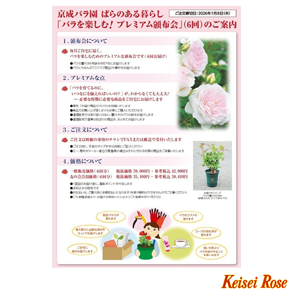 毎月ご自宅に届く、バラを楽しむためのプレミアムな頒布会です。ネット通販では通常取り扱いのない「バラの蕾付き6号鉢」を4月下旬にお届け。また、バラに因んだ「ワクワク商品」や資材を、大変お得にご購入いただけます。「バラを育てるのに、いつなにを揃えればいいの?」が、わからなくても大丈夫!必要な時期に、必要な商品をお届け致します。送料込み。こちらはガーデングローブがSサイズのセットです。